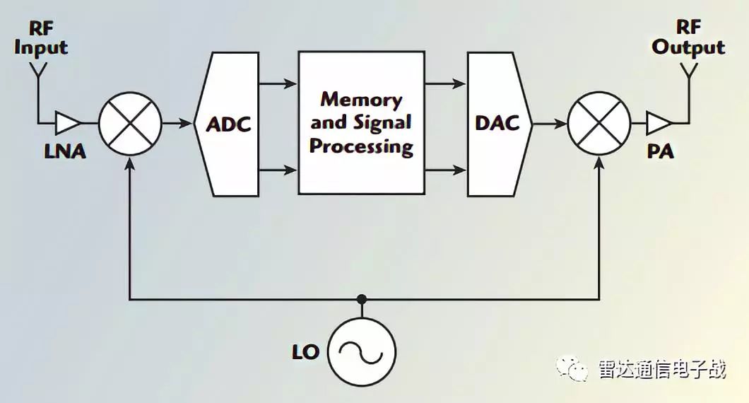 DRFM以数字方式操纵雷达信号,如图3所示。DRFM将接收到的RF信号进行下变频、滤波和数字化。数据被存储和(/或)修改,然后重新转换为模拟信号和使用与用于下变频相同的本机振荡器(LO)上变频为RF。最后进行射频的放大和转发。