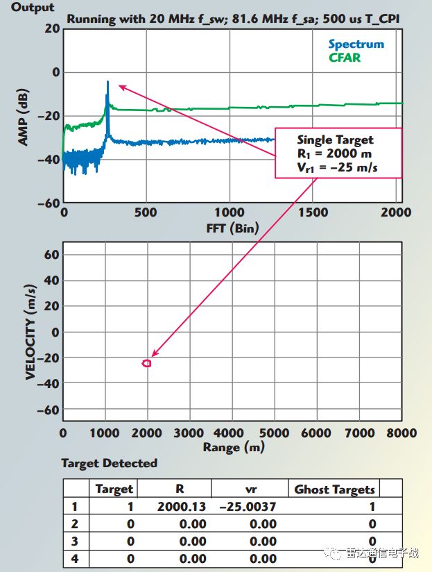频谱图显示单个局部极大值,其功率高于恒虚警率(CFAR)阈值。通过测量差频,计算距离和径向速度,与雷达目标生成器创建的目标匹配。COTS雷达目标模拟器可以在不同距离多普勒单元中产生多达20个目标。