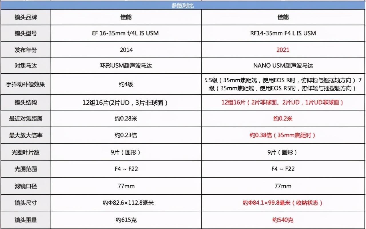 具备14mm的超广视角,构图上更有优势 配备镜头防抖,最高可实现7级防抖 镜头体积非常小巧,便于携带 改进成像分辨率新款RF14-35mm F4 L IS USM与EF 16-35mm f/4L IS USM的规格参数对比: