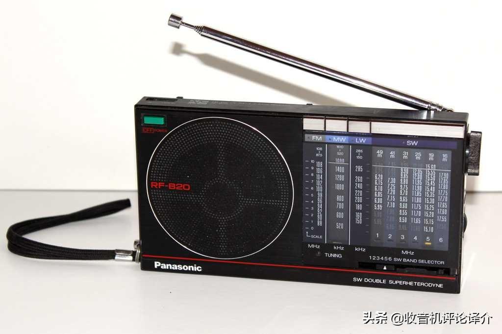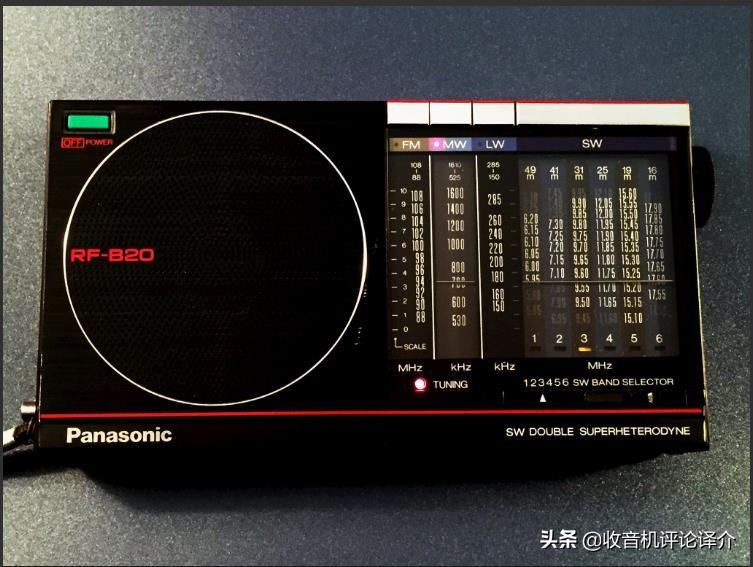 松下RF-B20L是在欧洲销售的版本, 它配有长波、中波、短波(分为6个米波段:49、41、31、25、19和16米波段)和调频波段。机壳正面标有“短波双超外差”的字样,这与我们熟知的第一中频为10.7MHz的索尼收音机的设计理念如出一辙,优点(例如:频率的稳定性)和缺点(例如:第一中频的带宽过宽,动态范围受限)也别无二致。