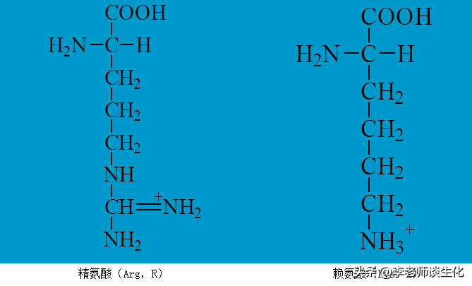 在基本氨基酸中,碱性氨基酸有三种,这里介绍属于脂肪族的两种:精氨酸(arginine ,Arg)和赖氨酸(lysine,Lys),组氨酸因为含有杂环,所以放在最后讲。