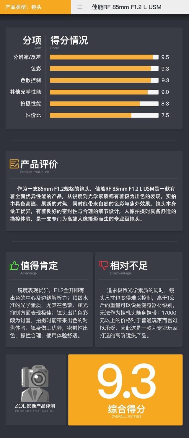 佳能RF 85mm F1.2 L USM镜头综合得分