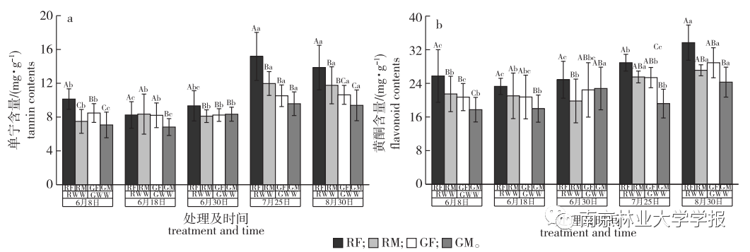 RF、RM、GF、和GM4种类型叶的单宁含量在6月8日—8月30日均呈现上升趋势, RF、RM和GM均在7月25日达到峰值,分别为15.18、11.97和10.52 mg/g,GF单宁含量于8月30日达到峰值10.63 mg/g。RF单宁含量在多数采样期(6月8日、6月30日、7月25日和8月30日)均显著高于其他3种类型叶(P<0.05 ,图2a) ,RM 在6月18日、7月28日和8月30日均显著高于GM (P<0.05),其他采样期无显著差异(P>0.05)。