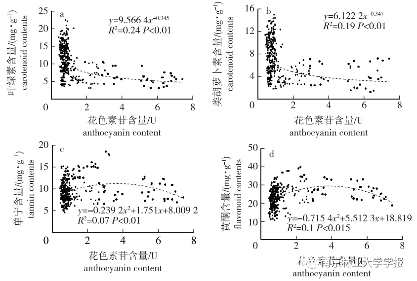 回归分析表明,青钱柳叶类胡萝卜素和叶绿素含量与花色素苷均呈现显著幂函数相关(P<0.01),R2分别为0.24和0.19,前两者含量随花色素苷含量上升均呈现逐渐平缓的下降趋势(图4a 、4b)。单宁含量和黄酮含量与花色素苷含量均存在显著二项式相关(P<0.01 ),R2分别为0.07和0.15 ,前两者含量随花色素苷含量上升呈现先上升后下降的趋势(图4c ,4d)。