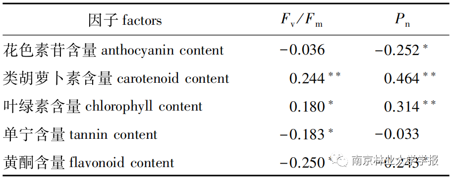 ▼表 2 青钱柳叶色素及多酚含量与Fv/Fm(n=24)及净光合速率(n=12)的相关性分析