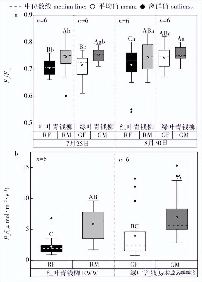 不同类型青钱柳叶净光合速率(P.)的差异见图3b。方差分析表明, RF的Pn最低,显著低于RM的Pn(P<0.05),但与GF无显著差异(P>0.05),与 RF的Pn平均值相比,GF、GM 和RM分别高出79% 、214%和164%。
