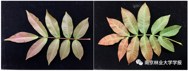 青钱柳(Cyclocarya paliurus)是我国特有的多功能树种。已有研究证明,青钱柳次生代谢物含量在种源、家系内部存在较大变异,因此,应从单株水平开展青钱柳特异性种质资源的评价筛选,以求精准筛选优良个体,并进行无性繁殖。田力等研究发现收集的青钱柳种质资源中存在少量红叶个体,其嫩梢新叶呈现显眼的红色,相对绿色新叶个体有更丰富的景观效果,具有更高观赏价值,且红叶个体的青钱柳在总黄酮、总三菇和多糖等生物活性物质与绿叶青钱柳个体存在差异。然而,红叶青钱柳的叶色转变与光合特性、次生代谢物的累积规律间的关系尚不明确。因此,本研究通过测定不同表型和不同季节青钱柳叶花色素苷、类胡萝卜素和叶绿素3类主要呈色色素,以及黄酮、单宁两类抗性物质含量及净光合速率( P n)和PSⅡ最大光化学效率( F v/ F m),比较红叶青钱柳与绿叶青钱柳的差异,分析两者叶主要色素、多酚类物质含量和光合特性间的关系,以期为青钱柳高生长、高抗性、高质量优良单株筛选提供科学依据。