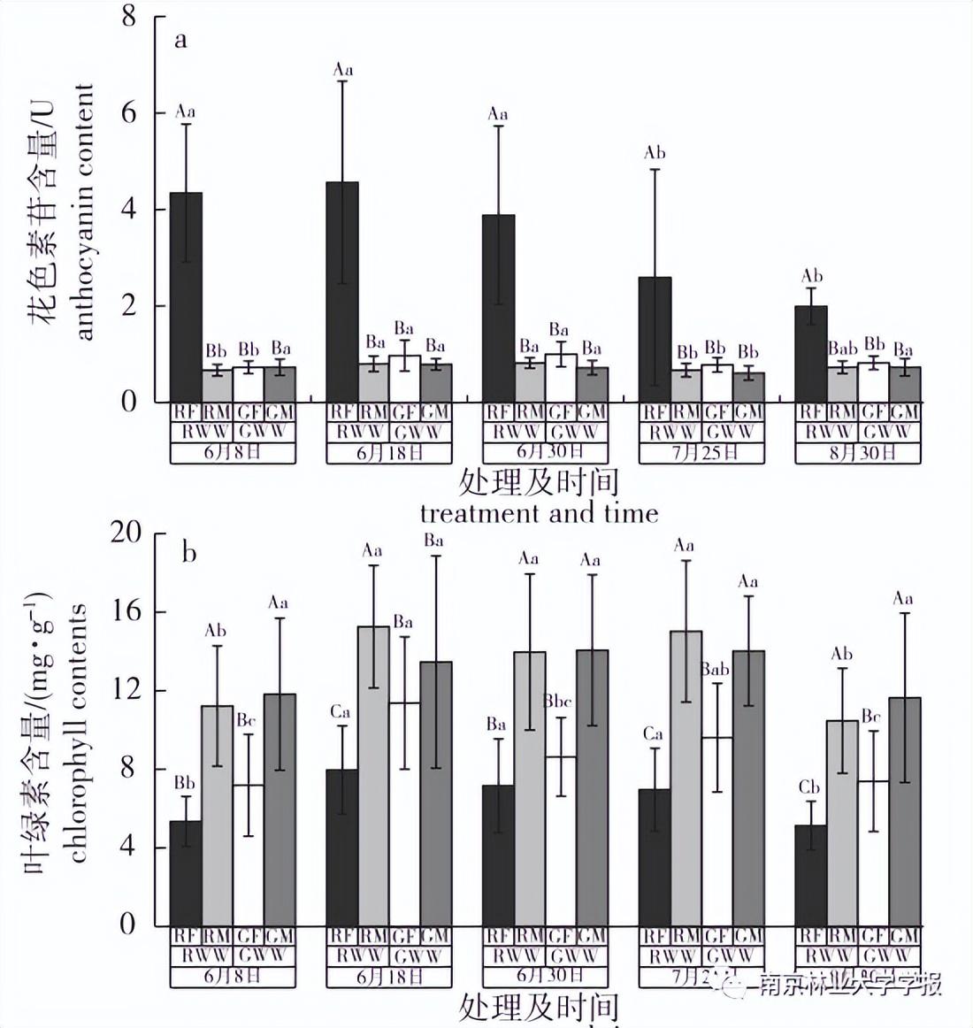 分别于2020年6月7 日、6月18日、6月30日、7月25日和8月30日采集标记侧枝当年生枝条的新叶和成熟叶。将枝条从上到下第2、3侧枝上完全展开的叶作为新叶(红叶个体新叶记作RF,red fresh ,绿色新叶记作GF , green fresh) ,将第6、7叶当作成熟叶(红叶个体成熟叶记作RM , red mature ,绿叶个体成熟叶记作GM , green mature),每根一级侧枝采5片成熟叶、5片新叶。剪下小叶,混匀后放入自封袋于4 ℃保存,用于花色素苷、叶绿素、类胡萝卜素、单宁和黄酮含量的测定。