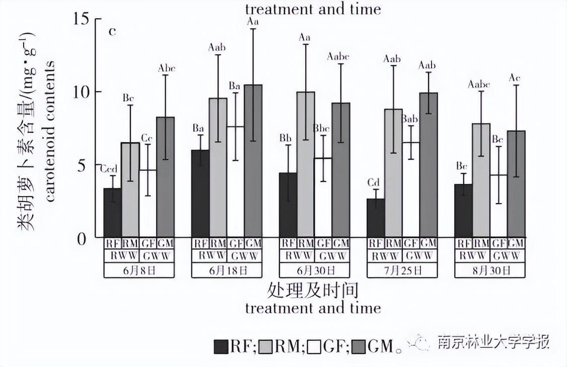 RF的黄酮含量在各采样时期均高于其他3类型种叶(图2b) ,但只在6月8日存在显著差异(P<0.05),就新叶而言,RF黄酮含量在各时期均高于GF,但只有在6月8日两者存在显著差异(P<0.05),就成熟叶而言,RM黄酮含量在6月8日和6月18日显著高于GM,但在6月30日、7月25日和8月30日两者均无显著差异。