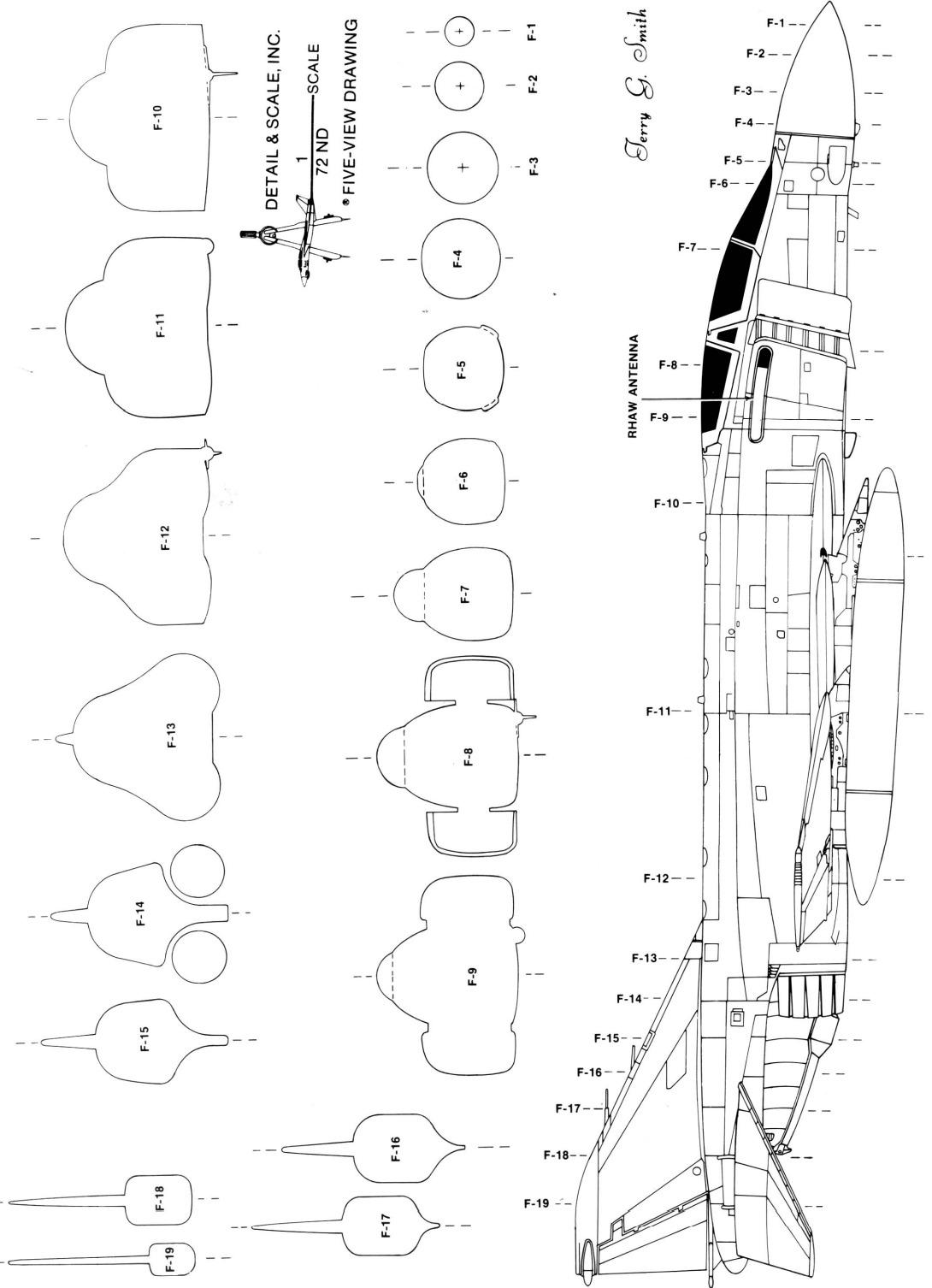 RF-4B: 海军B型的侦察改进型,无军械,单操纵系统,特征为机鼻的侦察舱。