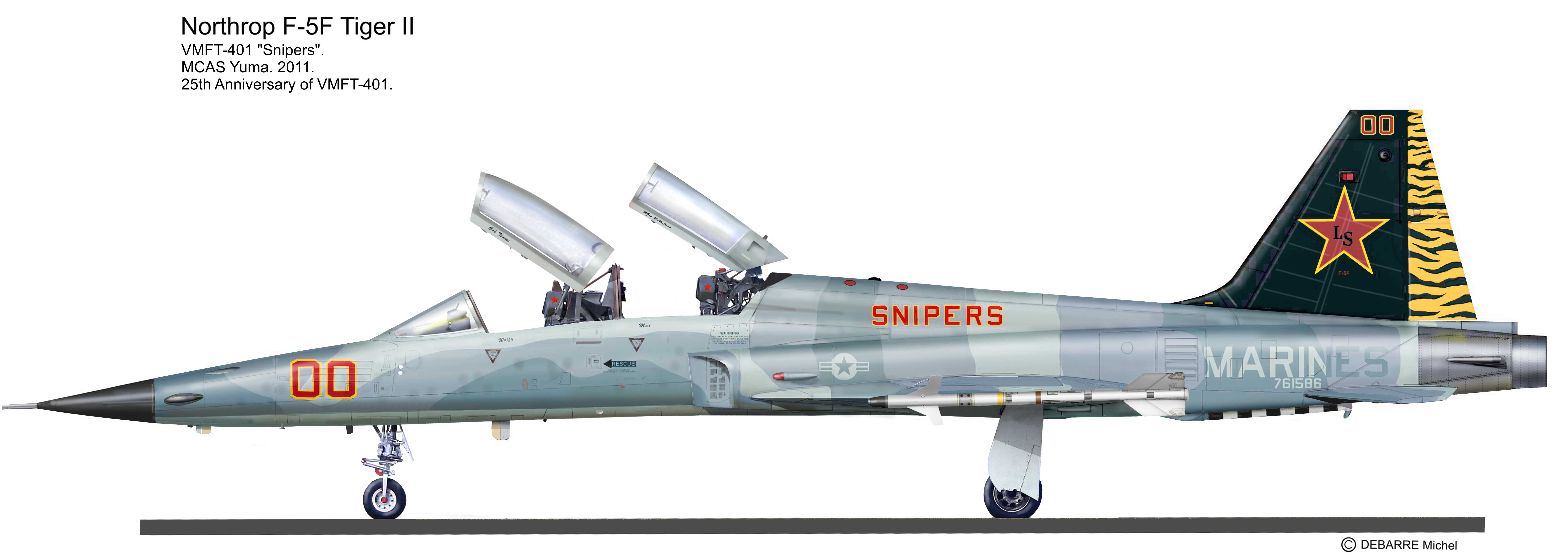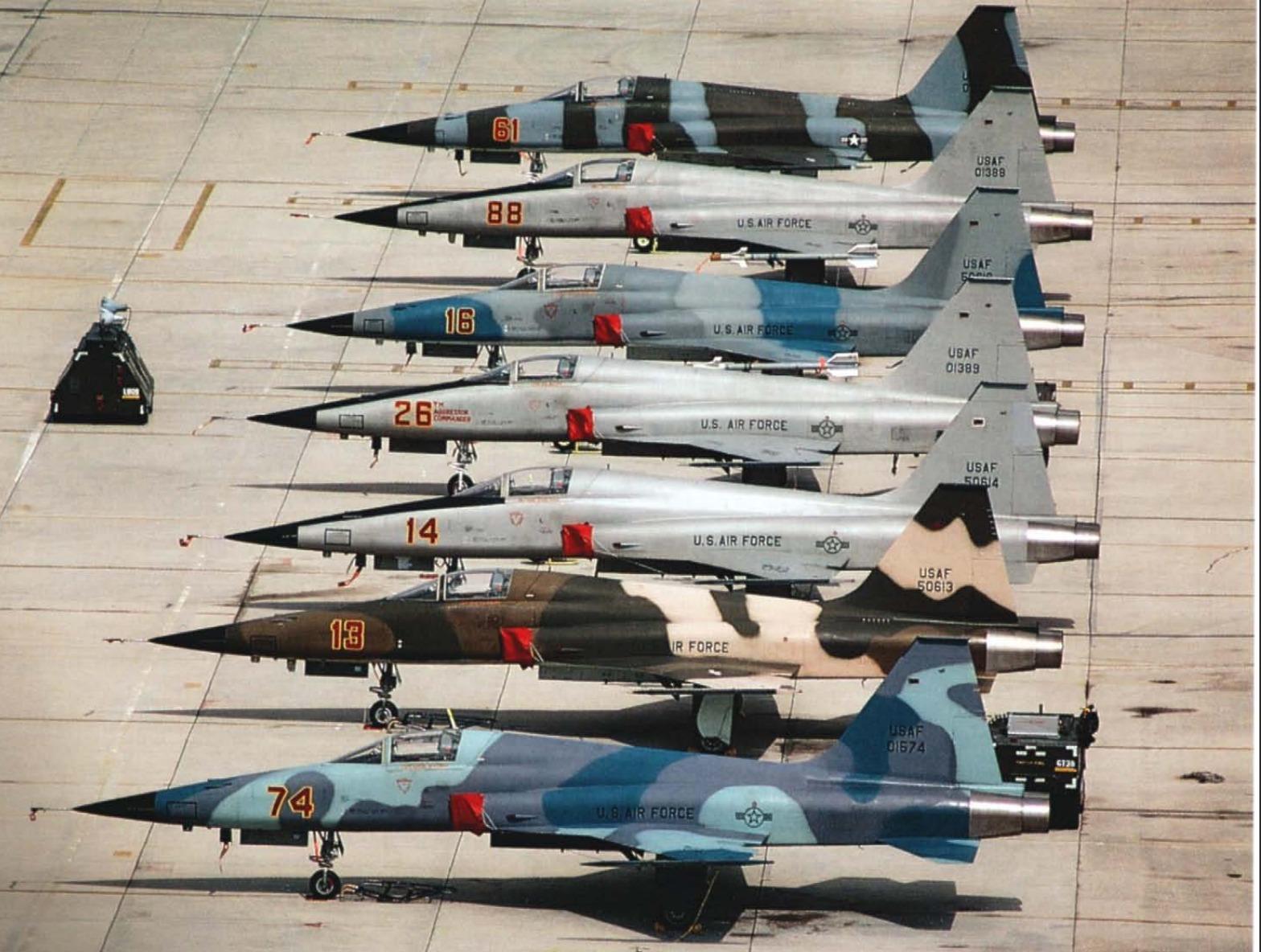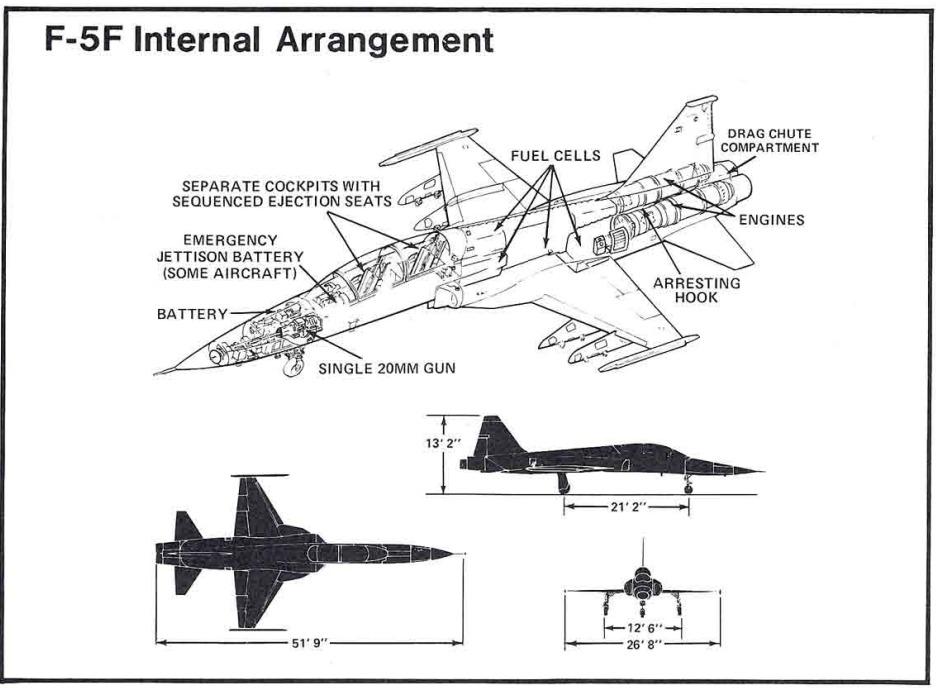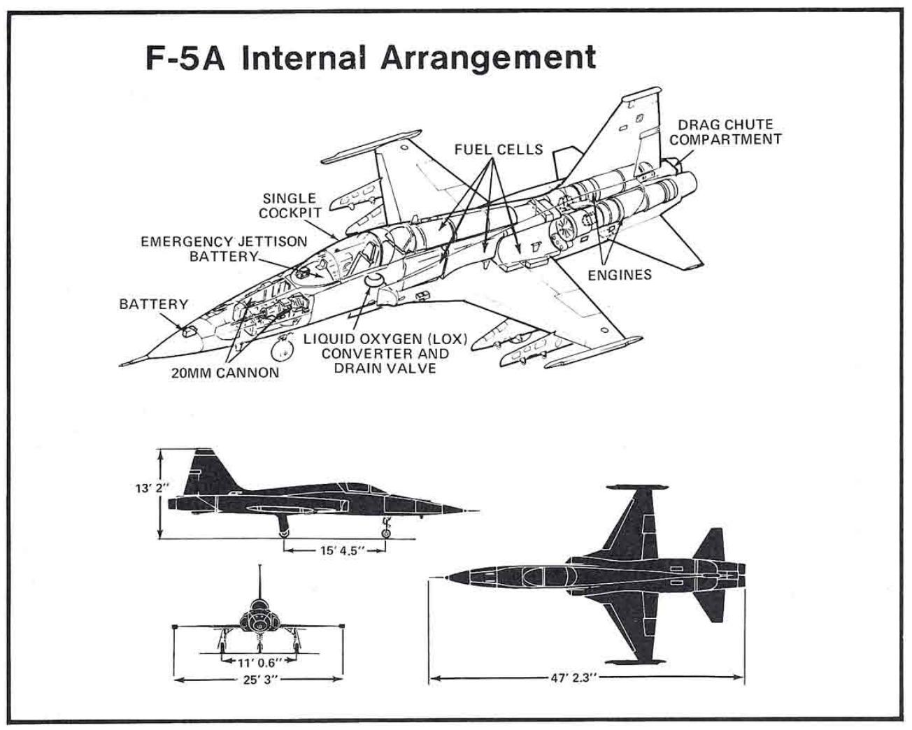 诺斯罗普公司的战斗机杰作,1959年7月30日首飞,1962年中标了美军军援战斗机项目。所以获得“自由战士”正式绰号,有趣的是F-5E/F时绰号变更为“虎II”。越南战争时期美军曾经计划采购自用型号的F-5,预定了F-5 C/D的编号,但是未能服役。