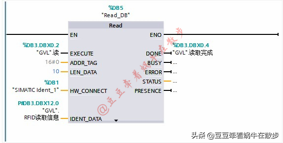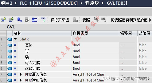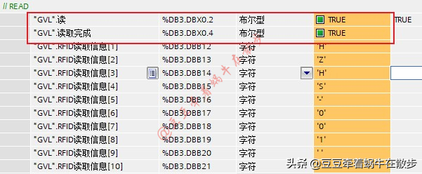 2、 首先复位RFID读写器,将“GVL.读”变量置位,读写器变成绿色常亮时表示复位完成,复位“GVL.读”变量。