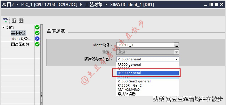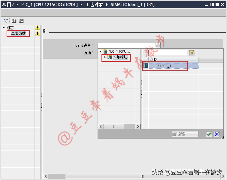 2、 工艺对象参数设置。选中“基本参数”,在右侧的窗口中选择组态的Ident设备,双击确认。