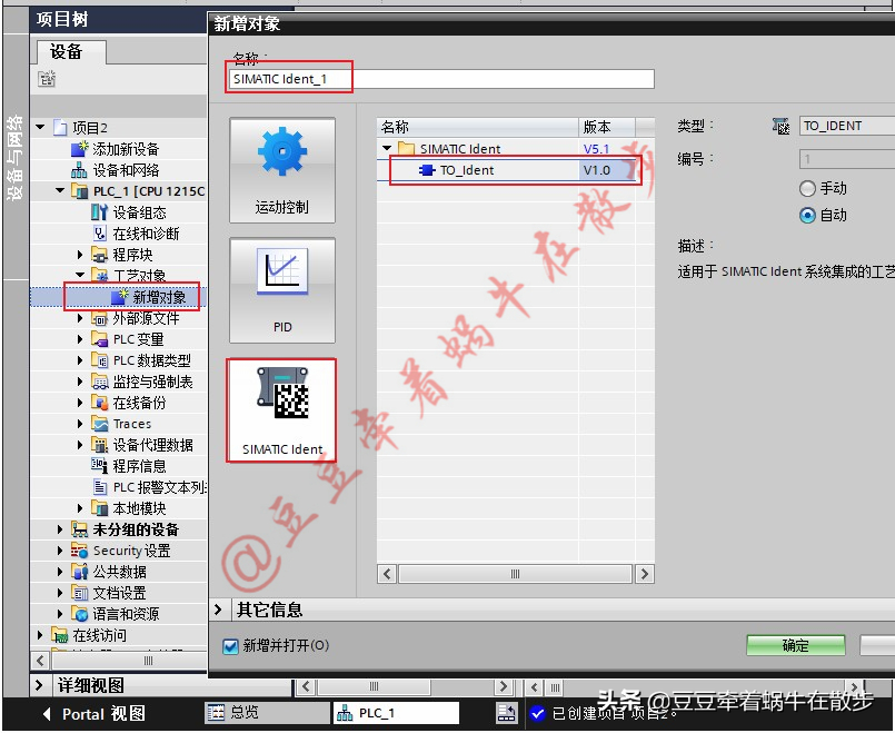1、 项目树中依次找到工艺对象目录,双击“新增对象”,选择“SIMATIC Ident”,选中“TO_Ident”,输入对象名称,点击“确定”。注意SIMATIC Ident 版本在5.1及以上。