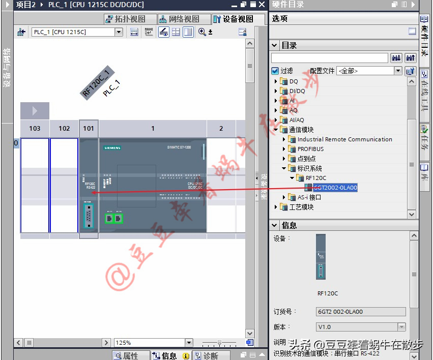 2、 RF120C硬件配置。在“设备视图”下,依次点击“硬件目录”、“通信模块”、“标识系统”、“RF120C”。找到RF120C通信模块,双击RF120C或者拖拽到导轨上。