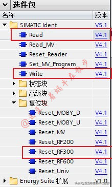 2、 新建函数块,在指令中找到RFID相关的指令,主要使用三个指令复位指令Reset_RF300、写入指令Write和读取指令Read。