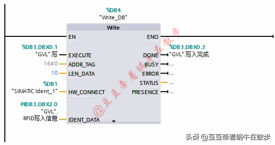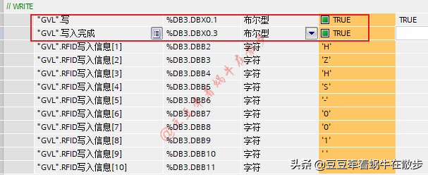 3、 置位“GVL.写”,当“GVL.写入完成”变成1时,表示数据写入完成,复位“GVL.写”。