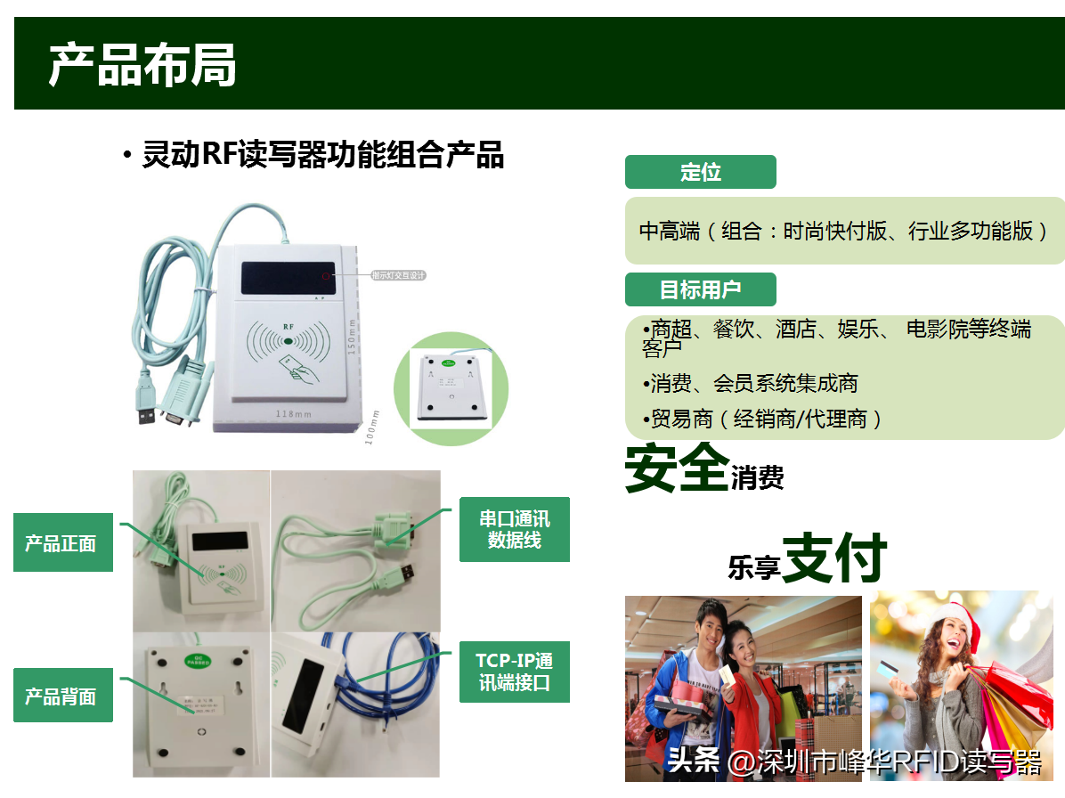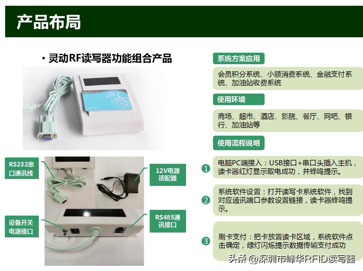 RF 非接触式智能 IC 卡读写设备广泛应用于个人身份安全认证、访问控制、考勤门禁系 统、停车场、一卡通饭堂系统,物流以及供应链管理等领域。