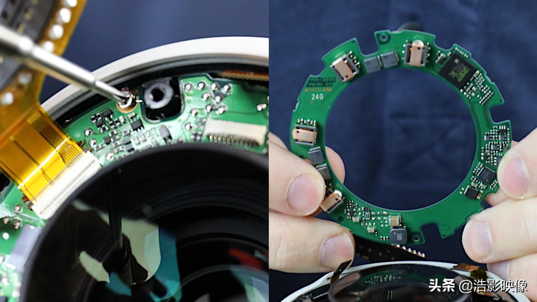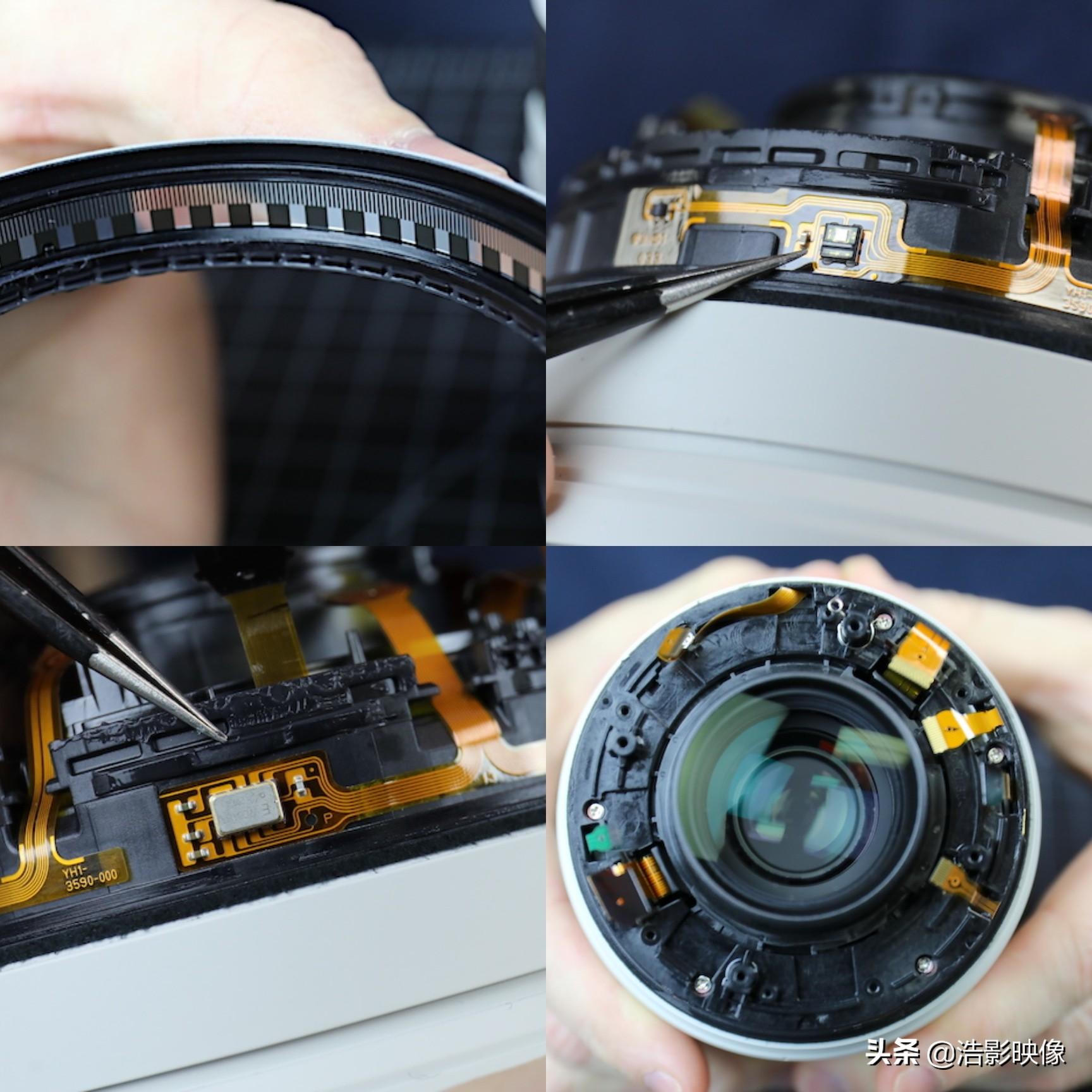 下面可以看到有刻度的齿圈和对应的光学传感器,用于读取旋转时候的刻度数值。后面还有用于防抖的运动传感器。最后露出来接下来组件的紧固螺丝和PCB线。