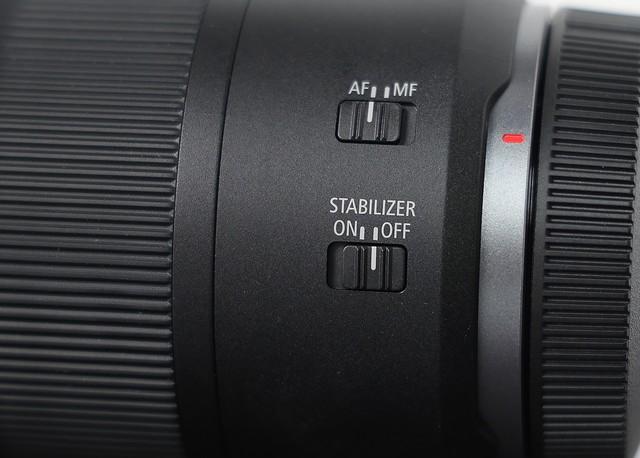 在镜头靠近卡口的位置有对焦切换和防抖开关,另一侧是变焦锁定拨杆,可以将镜头锁定在100mm焦段,避免携带时镜头因自重而下滑镜筒。