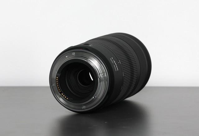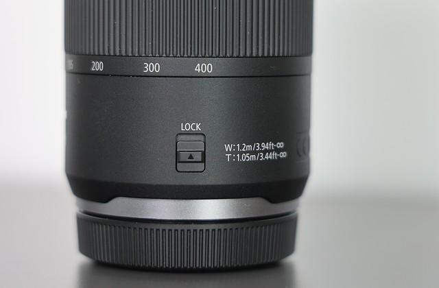 多功能控制环之后的则是对焦环和变焦环。这枚镜头采用外变焦设计,400mm端镜头长度还是很可观的。变焦环非常宽大,表面为条纹状的橡胶蒙皮提供了足够的摩擦力,变焦时阻尼适中手感细腻,配合较小的直径单手就可以轻松调节焦距,转动角度也并不大,变焦环后面提供了焦段标识方便用户操作。