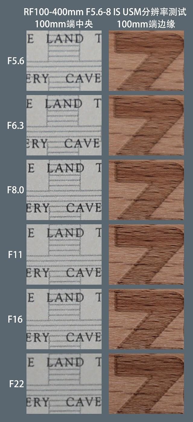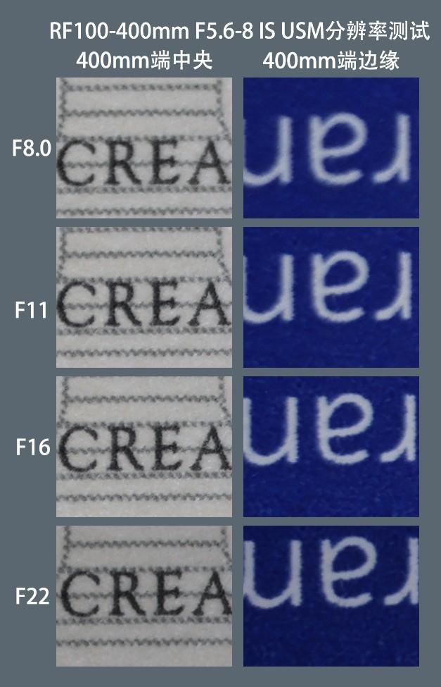 RF100-400mm F5.6-8 IS USM镜头在400mm端的分辨率表现也很优秀,光圈F16时分辨率表现最为优秀,F22光圈下画质也只是轻微下降。