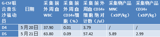 2019年5月17日再次入院动员,当日开始以G-CSF 5ug/kg/12h皮下注射,5月20日晚上23:30给予普乐沙福固定剂量20mg(患者体重60kg),5月21日一次性采集到CD34+细胞2.99x106/kg,采集结果见表2,加上前次总共采集CD34+细胞达到4.44 x106/kg。