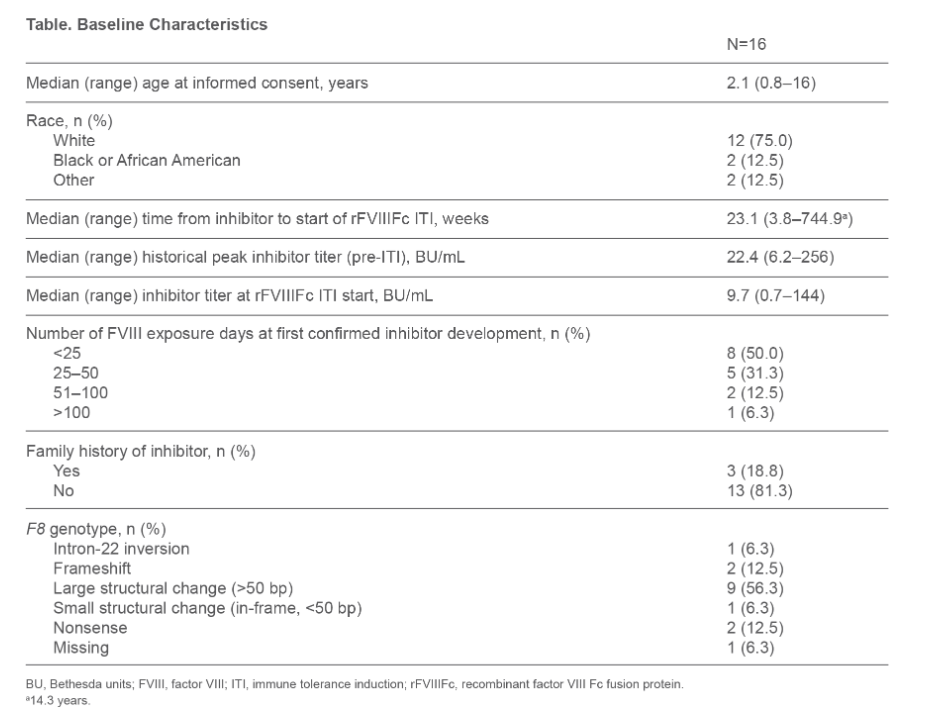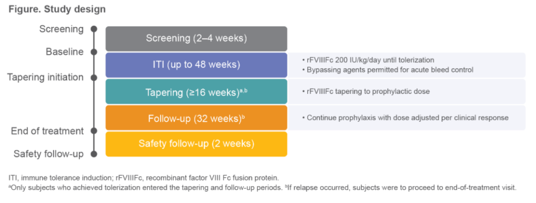 初次筛选后是ITI期,在此期间,所有受试者都接受rFVIIIFc 200 IU/kg/天,直到耐受治疗或48周后(如下图)。随后,剂量逐渐减少至标准预防和随访。主要纳入标准包括男性重度血友病A,高滴度抑制物(历史峰值≥5 BU/mL),以及之前使用任何血浆来源或重组标准半衰期或EHL FVIII进行治疗。主要终点是使用rFVIIIFc的耐受时间(成功的ITI),定义为抑制物滴度<0.6 BU/mL,增量恢复(IR)≥预期IR的66%(IR≥1.32 IU/dL/IU/kg)(均在连续两次访问中),以及48周内t½≥7小时。次要终点包括实现ITI成功的受试者数量、年化出血率(ABR)和不良事件(AE)。