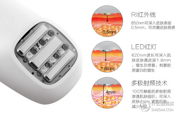 除了射频提拉祛皱,这个红光功能也是机子的亮点。不同的红外线和红光,深入皮肤的厚度不一样,红光改善皮肤状态的同时,刺激胶原蛋白的生长!而且在美白的这一块,就有lightstim等品牌,利用led红光达到消炎嫩肤美白的作用。