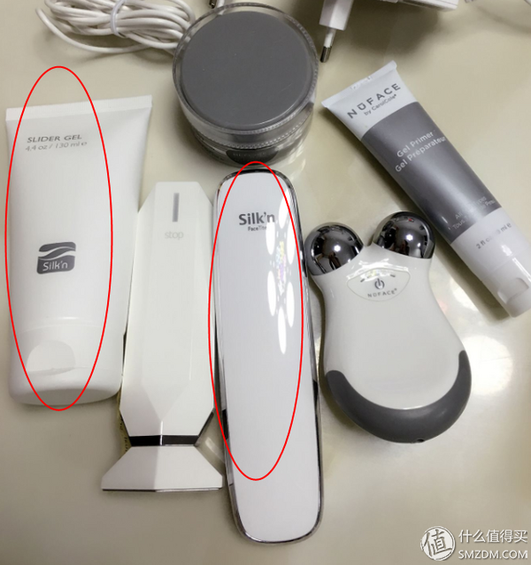 在使用silkn的时候,也是先用他的配套凝胶,上图圈出的左边瓶装就是他的凝胶,这个凝胶简直就是太太太清透了,非常好清洗,但是太清透带来的问题,就是涂在脸上不一会,就被仪器蒸发了,需要及时的补充!