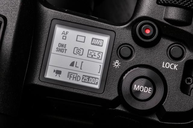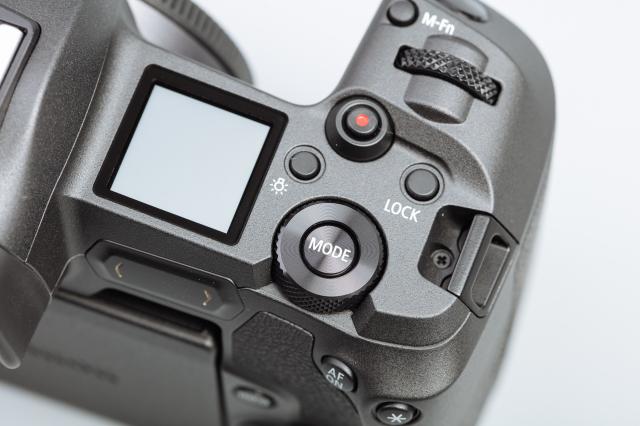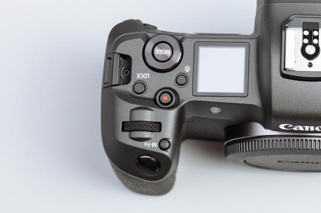 顶盖前面板可以看到在卡口左右两侧有立体声麦克风拾音孔,左侧是EOS标志及下方的R标识,右侧接近手柄区域是对焦补光灯。总得来说设计较为克制从容,延续了精炼简单的设计思路。