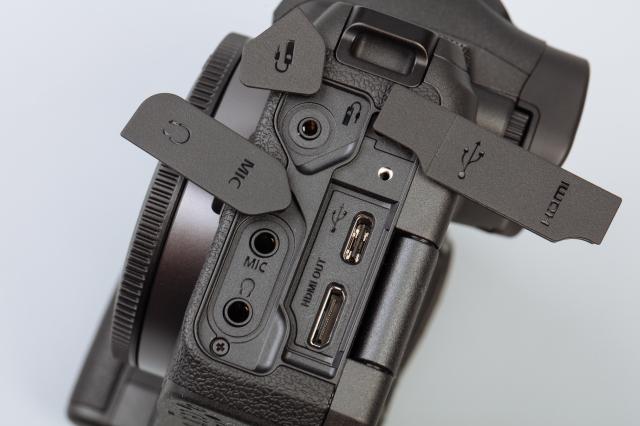 机身左侧是大部分接口区域,具备单独的遥控快门接口、外置麦克风&监听耳机接口、Type-C数据接口&HDMI输出接口。