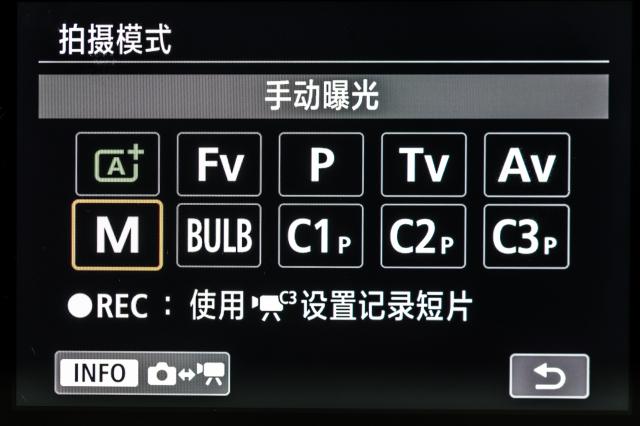 模式按钮按下后,显示EOS R的模式界面,可以通过拇指处的info按键,在静态拍照模式和视频模式下切换。静态模式显示大家非常熟悉的各类M、A、S、P、场景自动、用户自定义挡位,并且提示默认按下视频按钮,将采用视频自定义3模式进行短片记录。