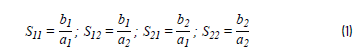 示意图图1显示的波量a是入射在器件端口1和端口2上的电压波的复数幅度。如果使用相应的波量a1或a2依次刺激一个端口,同时另一个端口端接到匹配的负载中,我们就可以根据波量b来定义器件的正向和反向响应。这些数量代表了从网络端口反射和通过网络端口透射的电压波。基于所得复数响应和初始刺激量的比率,我们可以定义双端口器件的S参数,如式1所示: