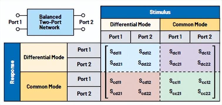 图2.双端口平衡RF网络及其混合模式散射矩阵
