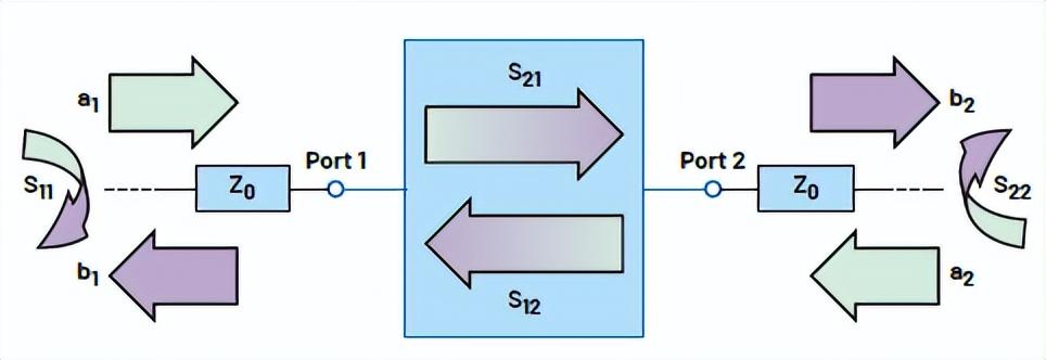 S参数量化了RF能量是如何通过系统传播的,因而包含有关其基本特征的信息。使用S参数可以将最复杂的RF器件表示为简单的N端口网络。图1显示了一个双端口未平衡网络的例子,该网络可用于表示许多标准RF元件,例如RF放大器、滤波器或衰减器等。