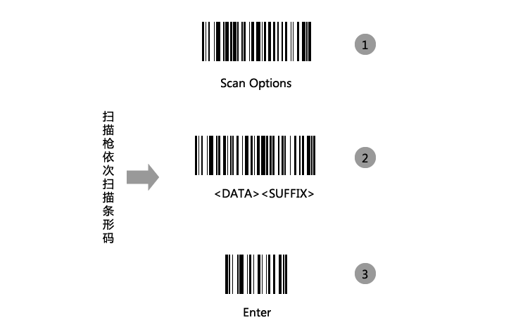 首先扫描图片中Scan Options条码再次扫描图片中<DATA><SUFFIX>条码最后扫描图片中Enter条码说明:扫码枪没有自动回车一般体现在系统里扫描后鼠标焦点没有自动往下一个输入框跳,或者扫描后网页里跳出窗口(之前碰到过触发F12快捷键打开浏览器控制台的情况)。一般扫码枪购买来其包装盒里都有使用说明书《快速入门指南》,请参照相关校正方法,另外,各种扫码枪可能存在差异请求助产品技术支持或客服处理。