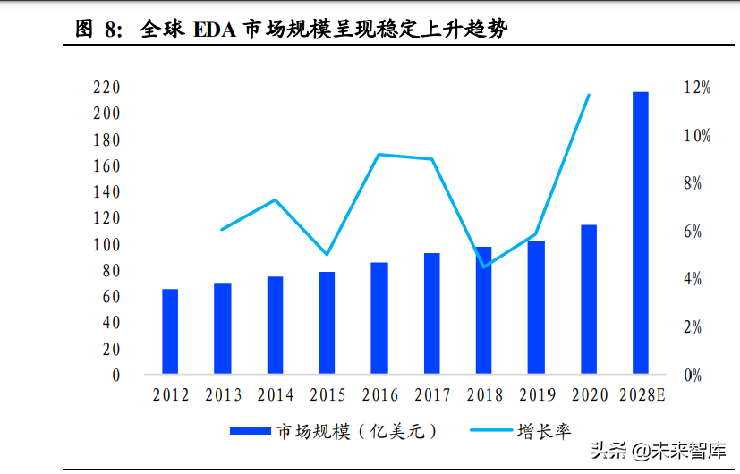 先进工艺的技术迭代和下游领域需求驱动全球 EDA市场规模稳定上升。 EDA工具应用于集成电路的设计、制造及封测各个环节,其市场需求与 集成电路行业的发展紧密相关。近年来,集成电路产业技术迭代较快, 日益复杂化的设计及制造要求催生了越来越多的 EDA工具需求,推动 全球 EDA市场发展。根据 SEMI 统计,2020 年全球 EDA市场规模为 114.67 亿美元,同比增长 11.63%,实现 8 年 CAGR7.28%,呈稳定上升 趋势。根据 Verified Market Research 数据,全球 EDA市场规模有望于2028 年达到 215.6 亿美元,2020-2028 年 8 年复合增速为 8.21%。