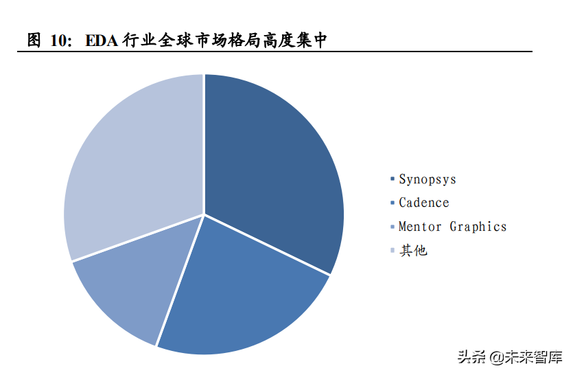 软件的从众特性是造成 EDA 市场高度集中的原因之一。EDA行业是技 术、算法高度密集的行业,其底层思想是数学、物理等科学定理,是能 够被大众接受的,因此 EDA软件是标准化的。经过众多用户长期使用 的产品化软件稳定且质量较高,并持续进行优化和完善,因此产品化软 件的消费者具有从众特性。考虑到 EDA工具对企业发展的重要性,集 成电路设计和制造商通常选用市场上流行的 EDA工具供应商,以避免 由于工具质量、性能等问题造成的损失。领先的 EDA工具提供商与普 通提供商间的差距逐渐拉开,形成了寡头垄断的局面。