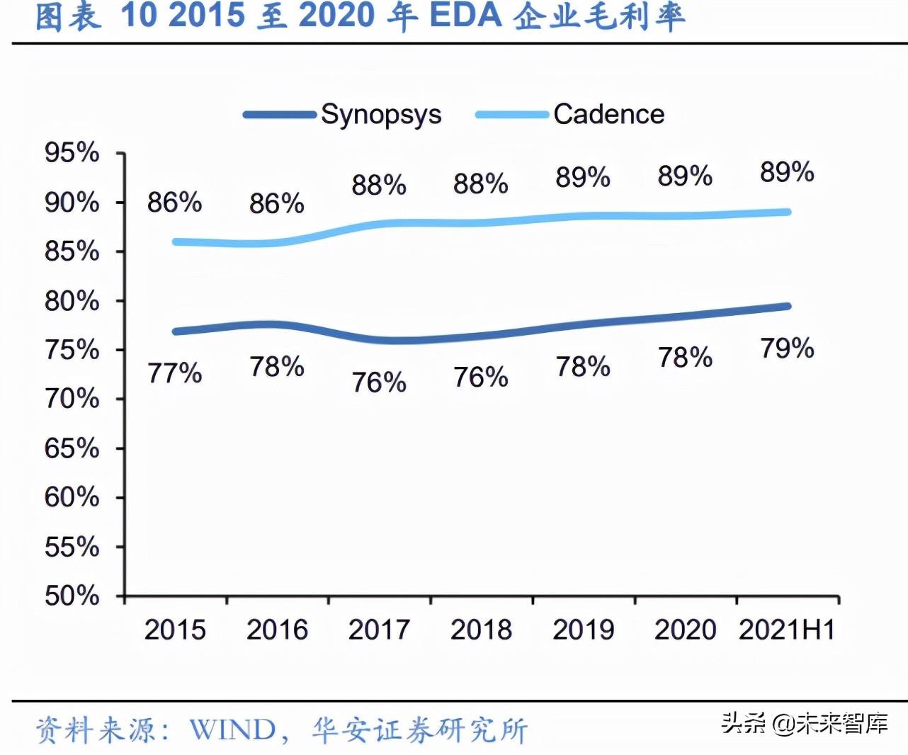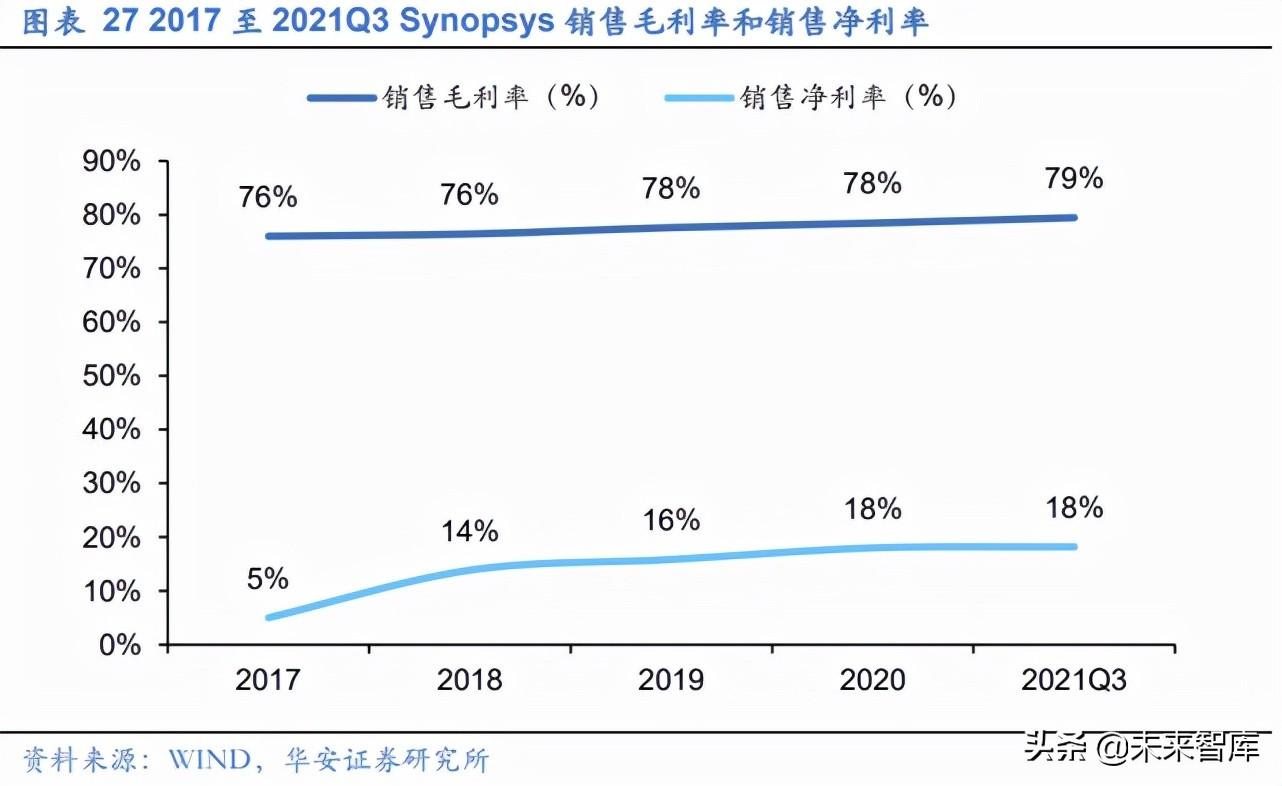 EDA 产业技术壁垒高筑,EDA 软件业务享受近 90%毛利率。 正如前文所说,EDA 是算法密集型产业,需要对数千种情境进行快速设计探索,涉及计算机、数学、物理等 多基础学科的结合应用。这种基础学科技术的不断突破和应用,需要通过长时间的技术 研发投入和专利积累来实现。目前,头部企业对 EDA 的长期高强度的技术研发投入成为 其保持长久竞争力的关键之一,成熟的 EDA 企业纷纷形成了极高的技术壁垒。过去十年 间,世界头部 EDA 企业 Cadence 和 Synopsys 的研发投入始终保持在 30%以上。另一 方面,超高的研发投入与技术壁垒让行业内的企业享受到了近 90%的毛利率,行业内头 部企业 Synopsys 和 Cadence 的总体毛利率常年维持在 80%左右,并呈现持续上升的 趋势。