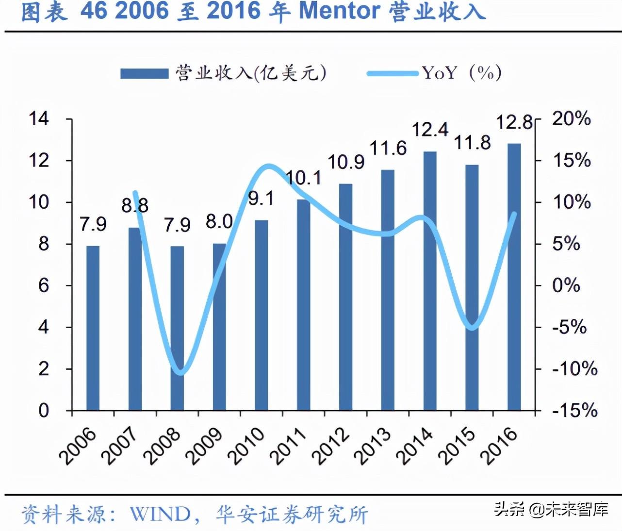 营收增速出现一定波动,与西门子合力未来业绩有望持续向好。 2006 年至 2015 年 Mentor 营收增速波动较大,但除去 2008 年与 2015 年,公司营收整体增速始终维持在 8%左右,并有改善趋势,符合行业整体增速。从盈利能力来看,公司 2008 年与 2010 年 出现亏损,随后盈利出现爆发式增长,并逐渐稳定,整体盈利水平在一亿元左右。2016 年之后公司被 Siemens 收购后,成为 Siemens EDA 部门。我们认为,通过与 Siemens 的协同,公司未来竞争力有望加强,实现市场份额的快速增长。