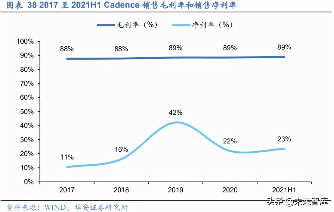 毛利率持续保持高位,净利率增长显著。 从毛利率来看,公司毛利率多年来一直维 持在 88%以上,高于 Synopsys、Mentor 等同业公司。从净利率来看,2017-2021H1 期 间,公司净利率由 11%增长至 23%,提升了 12pct。2019 年,由于收并购引起公司税收 有所波动,去除此影响,公司净利率逐步提升,获利能力不断增强。