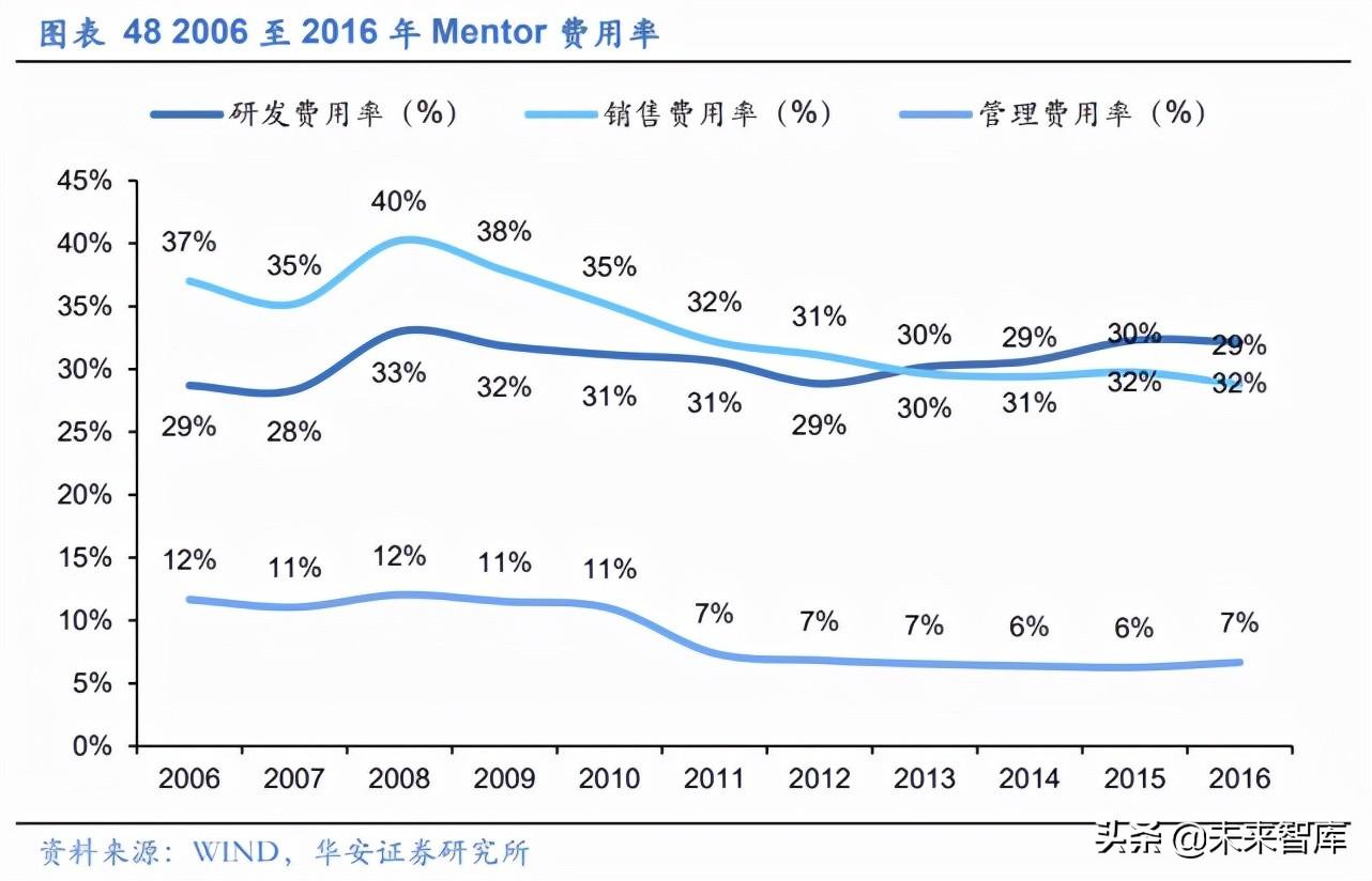 研发费用率稳步上升,获取持续竞争力。 Mentor 2012 年以来,研发费用率稳定抬 升,销售费用率持续下降。从研发费用角度,Mentor 研发费用主要体现在两个方面,一 方面是对已有产品的持续改进和新产品的开发,另一方面在于通过兼并收购来扩大现有 产品,并寻求新的业务领域。由 Mentor 年报可知,员工薪酬和兼并收购费用是研发费用 的主要组成部分,公司对核心技术研发人员的高投入与兼并收购是公司在 EDA 市场中 长期取得竞争优势的重要原因。从销售费用角度,销售费用绝对值相对稳定,在公司营 收稳步增长的情况下,销售费用率有所下降。此外,公司海外市场持续扩大,公司销售 费用率的降低一定程度上能够反应公司在 EDA 市场具有销售渠道优势,并且其海内外 市场进一步成熟,有利于销售费用率的降低。