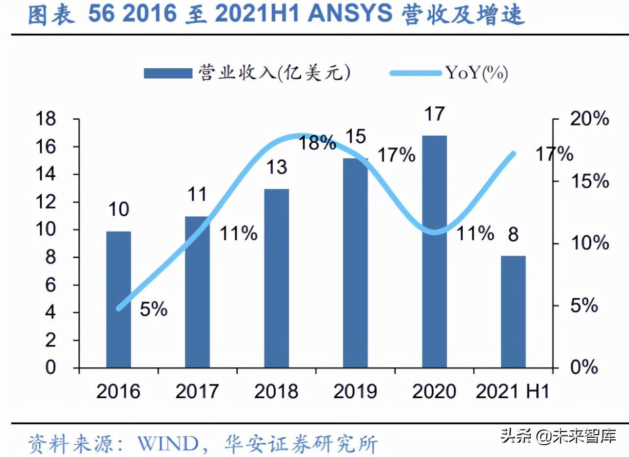 软件许可维系公司营收高增长,维护服务提升产品附加值。 Ansys 近五年营收稳定 增长,由 2016 年的 9.8 亿美元增长至 2020 年的 17 亿美元,实现 CAGR 11.2%。2020 年营收同比增速放缓主要受疫情与中美技术竞争的影响。伴随疫情形式好转,2021H1 公 司营收进入恢复期。分业务看,软件许可与维护服务是 ANSYS 的两大收入模式。2018 年起,软件许可收入占比存在明显的下降,而维护服务收入提升,主要原因系:2018 年 起,公司将维护服务与公司软件许可业务直接绑定,软件售后收入被直接划归入维护服 务收入,使得维护服务收入占比提升。