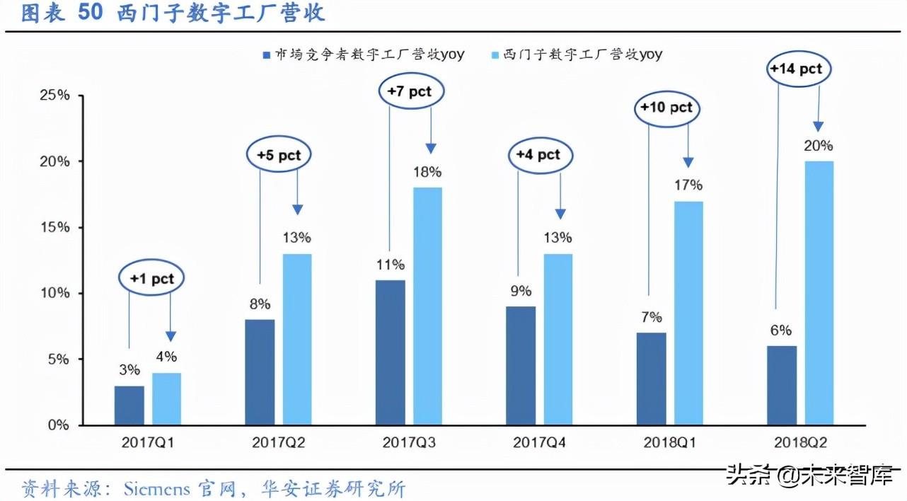 西门子收购 Mentor Graphic,相互协同实现双赢。 对于 Mentor Graphics 来说:被 Siemens 收购,一方面可以获得资金支持,缓解经营压力;另一方面可以协同 Siemens 原有产品服务,依托西门的渠道以及集团级和合作,自上而下迅速开拓市场,实现业务 的加速发展。对于 Siemens 来说:收购 Mentor 帮助 Siemens 把业务拓展到嵌入式软 件、SoC 设计和 EDA 工具等领域,从行业、产品设计领域和生产阶段方面对“数字工 厂”战略进行了补充,囊括 CAD、CAM 和 EDA 业务,形成完整的软件布局。此外, Mentor 为许多大型 OEM 和供应商提供 AutoSAR 等平台和集成工程服务,因此通过收 购,Siemens 能够借 Mentor 之力,把握汽车电子化机遇。完成收购后,西门子在数字 工厂行业的市场份额从 2017 年第一季度的 4%,迅速上升到 2018 年第二季度的 20%。