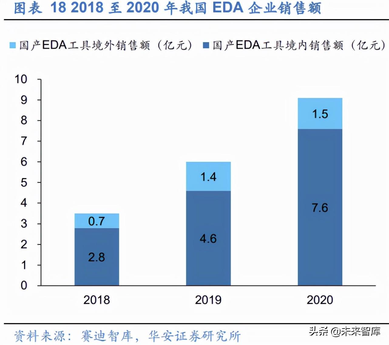 国内 EDA 市场快速发展,相关人才储备逐步上升。 从国内市场来看,Synopsys、 Cadence 和 Mentor Graphics(Siemens EDA)三大国际 EDA 厂商主导市场,但国内 本土品牌持续发力,在部分领域已经实现突破,整体份额持续上升。根据赛迪顾问数据, 国产 EDA 工具销售额在 2018-2020 年呈现逐年增长的态势。2020 年,国产 EDA 工具 实现 9.1 亿元的销售额,其中境外销售为 1.5 亿元,境内销售额为 7.6 亿元。此外,国 内 EDA 企业持续吸纳 EDA 相关人才,2018 年至 2020 年,我国 EDA 企业人才由 700 人增长至 2000 人,为未来我国 EDA 行业的持续技术突破打下了良好的基础。