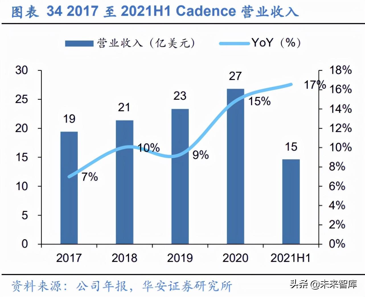 高研发费用率保障公司行业地位,技术进步加速产品迭代。 近年来 Cadence 不断加 大研发投入,研发费用率一直保持在 40%左右,高于 Synopsys、Mentor 等同业公司。 这使得公司产品更新迅速,例如 2021 年公司再次推出新一代的 Vision DSP 产品 P1 和 Q8。从营收数据来看,公司高投入高回报的策略收效显著,公司营收增速不断攀升, 2021H1 公司营收增速达 17%。