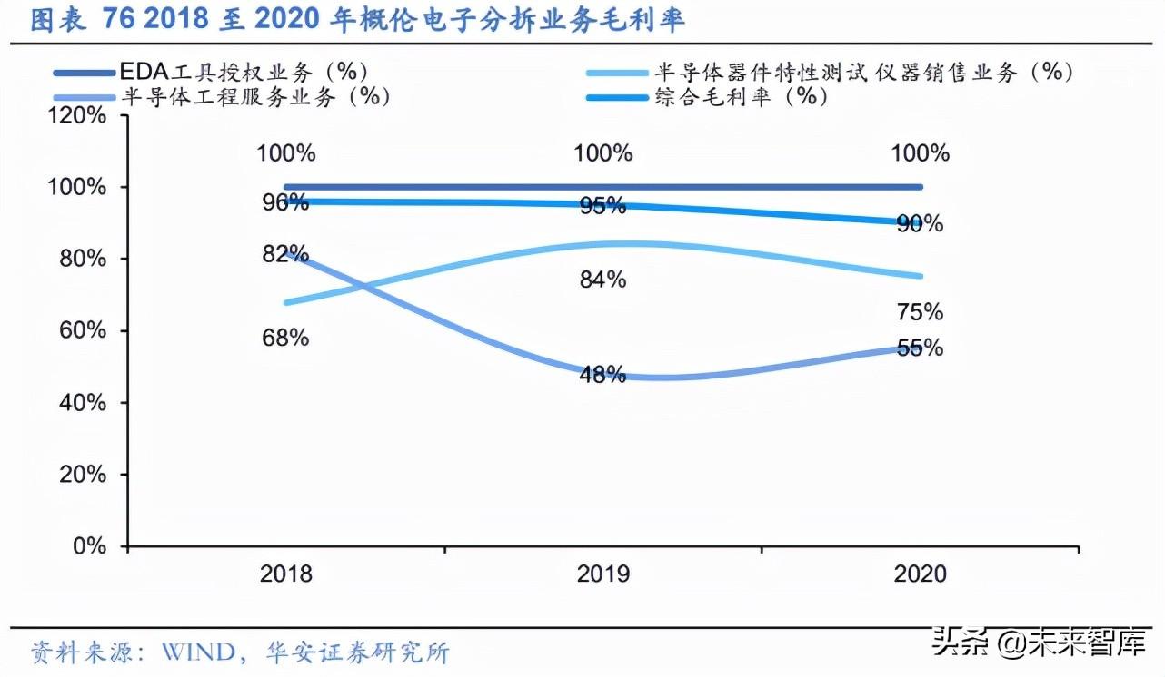 EDA 工具授权业务为主,整体毛利率持续保持高位。 公司 2018、2019 和 2020 年 毛利率分别为 96%、95%和 90%,总体毛利率持续保持高位。分业务来看,公司 EDA 工具授权业务以销售标准化 EDA 软件产品为主,其相应开发成本已计入研发费用,无对 应成本,从而形成了高达 100%的毛利率,也是公司整体毛利率维持高位的主要原因。 而半导体器件特性测试仪器销售业务近三年毛利率分别为 68%、84%和 75%,其单位成 本相对稳定,毛利率主要受单位售价影响,2020 年毛利率有所下降主要由于收购博达微 后新增 FS-Pro 产品,FS-Pro 相对于 9812DX 毛利率较低。此外,公司的半导体工程服 务业务近年来毛利率有所波动,主要系其业务规模相对较小,客户相对集中,公司在不 同项目中议价能力有所差异。
