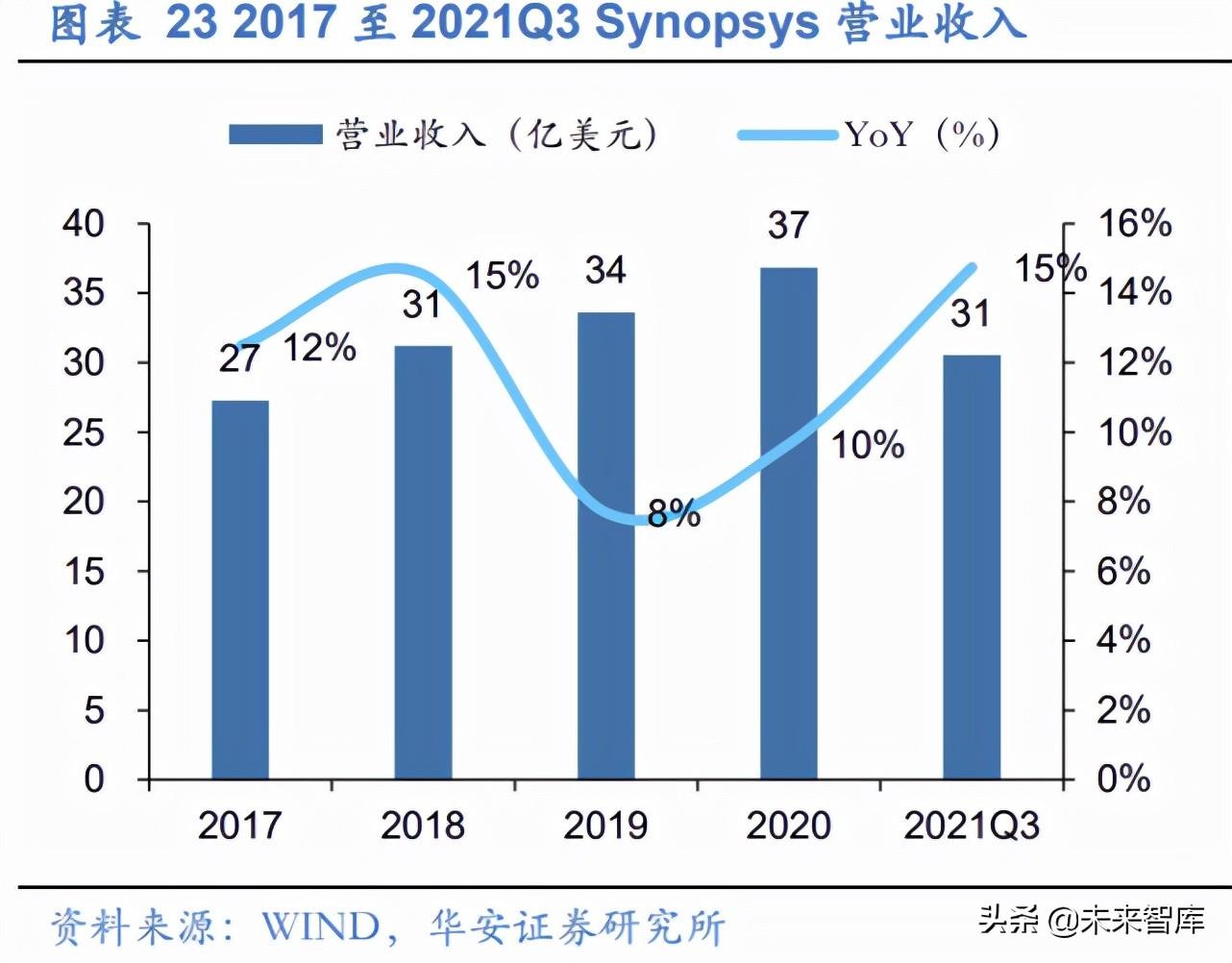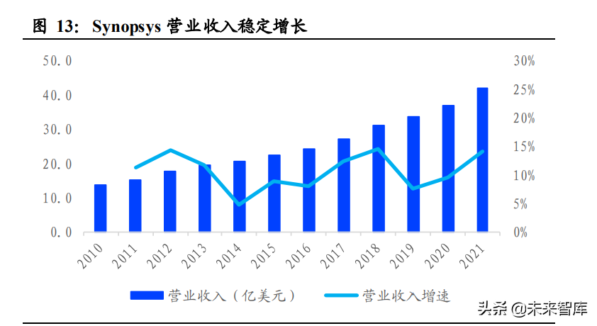 Synopsys 是全球 EDA 龙头企业,通过收并购实现快速发展。 Synopsys 目前是全 球排名第一的电子设计自动化(EDA) 解决方案提供商和芯片接口 IP 供应商。从公司产 品结构来看,公司历经三个发展阶段:1)初创期,专注于逻辑综合工具。1986 年, Synopsys 前身 Optimal Solutions, Inc.成立,专注于逻辑综合工具,开创了一个自上而 下设计定义的时代。1987 年到 1989 年,Synopsys 的营收从 13 万美元增长至 730 万 美元,实现 55 倍的高速增长。2)扩张期,快速丰富产品结构。1990 年,公司意识到无 法依靠一个产品实现持续发展,于是公司在随后的十年中进行了 20 起相关领域收购,并 逐渐在逻辑综合、模拟和测试三个技术领域确立了公司的领先地位。3)成熟期,确立全 球龙头地位。2002 年,公司收购 Avant,成为全球第一家可以提供顶级前后端完整 IC 设 计方案的 EDA 工具供应商。2008 年,公司成为全球龙头并保持至今。