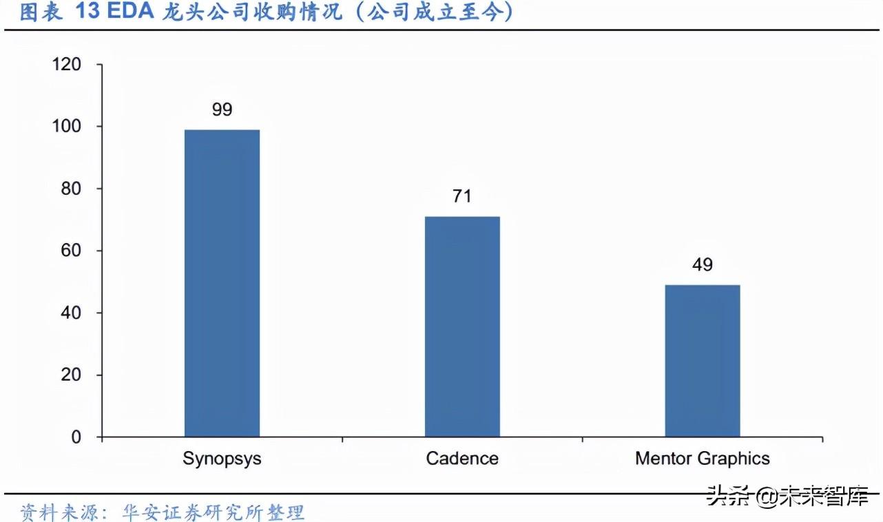 EDA 三巨头通过收购兼并从竞争者中脱颖而出。三家公司自成立以来, 通过收并购逐步掌握领先产品技术并补全自身产品线,截至 2021 年,合 计收购超 200 次。以 Synopsys 为例,2002 年,Synopsys 收购 Avanti公 司,使得 Synopsys 成为 EDA历史上第一家可以提供顶级前后端完整 IC 设计方案的领先 EDA工具供应商。在 Cadence 的众多并购案例中,1989 年收购 Verilog 是其最为重要的一次并购,它成功地解决了复杂度带来的芯片性能验证问题,也标志着 EDA 从设计领域同时进入了软件模拟和 硬件仿真领域,设计与仿真能够通过使用同一家公司的不同套软件来完 成。此外,在Mentor 发展的近30年历程中,其收购了Synergy Dataworks、 Silicon Compiler Systems 等众多在细分领域技术上数一数二的中小型 EDA公司,助力自身成为全球 EDA领导厂商之一。(报告来源:未来智库)